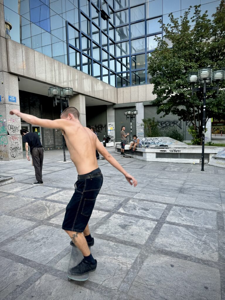 Αυτοί που σε μια άλλη εποχή θα με γοήτευαν– πριν από την πραγματική ζωή. Μερικά αγόρια έκαναν skate, λίγο πιο κάτω– αυτό το χωρίς φανελάκι που φωτογράφησα μου είπε «κουλ…» όταν του έδειξα το αυθόρμητό του πορτρέτο, σα να έδινε συναίνεση. Κι ήταν σα να έπαιρνα μια βαθιά ανάσα ανάμεσα σε τόση εναλλακτικότητα που ήταν απλώς βρωμιά!