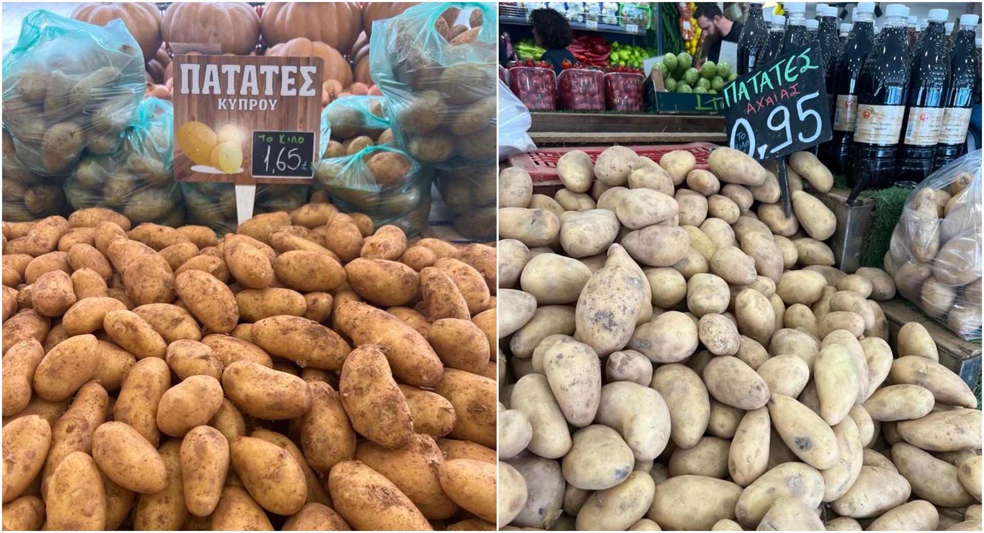 €1,65 το κιλό οι πατάτες Κύπρου σε ένα μεγάλο μανάβικο στην περιοχή του Γέρακα, στην Αττική. Και δίπλα, όπως βλέπετε στις δύο φωτογραφίες, στα €0,95 οι πατάτες Αχαΐας.
