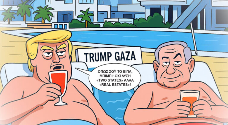Ο Τραμπ σκοπεύει να ανοικοδομήσει τη Γάζα – γιατί; Μήπως για να ζήσουν εκεί οι ξεσπιτωμένοι Παλαιστίνιοι; Αφού εκδιώχτηκαν κακήν κακώς, τώρα κλήθηκαν να επιστρέψουν – πού; Στα ερείπια της προηγούμενης ζωής τους; Μα, όπως έχει δηλώσει ο ίδιος, θέλει να μετατρέψει την περιοχή σε θέρετρο πολυτελείας – πού είναι η Ναόμι Κλάιν για να δει στην πράξη τα όσα αναλύει στο βιβλίο της Το δόγμα του σοκ (The shock doctrine – 2007). Καθώς χιλιάδες εταιρείες ετοιμάζονται, σύντομα θα αντικρίσουμε τον «αναδυόμενο καπιταλισμό της καταστροφής» με τη μορφή κάποιου Gaza Resort, παρόμοιου ενδεχομένως με το παλάτι του μίστερ «δοξάστε με» στο Mar–a–Lago. Πιθανώς να αντιγράψει και το καζίνο Trump Taj Mahal που έχτισε κάποτε στο Ατλάντικ Σίτι και έχει πια κλείσει.