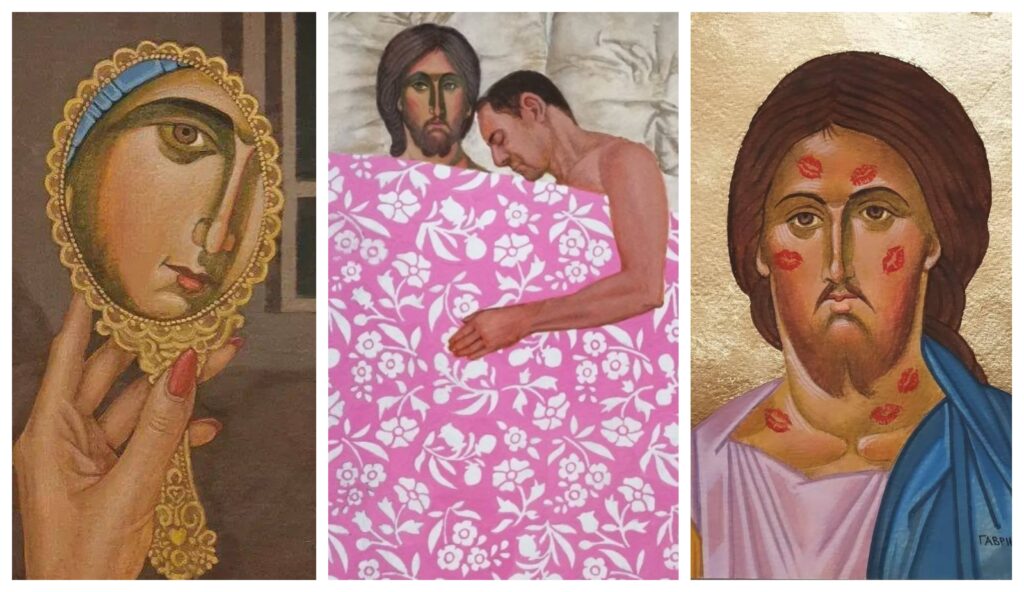 Και δεν είναι μονό αυτό, δεν ανέχτηκαν το πρόσωπο του Ιησού γεμάτο από φιλιά με κραγιόν. Μα, σε όποια Εκκλησία και αν πας σήμερα, αυτό που θα δεις είναι εικονίσματα με πρόσωπα και σώματα χαρακτήρων της αγιοσύνης γεμάτα κοκκινάδια.
