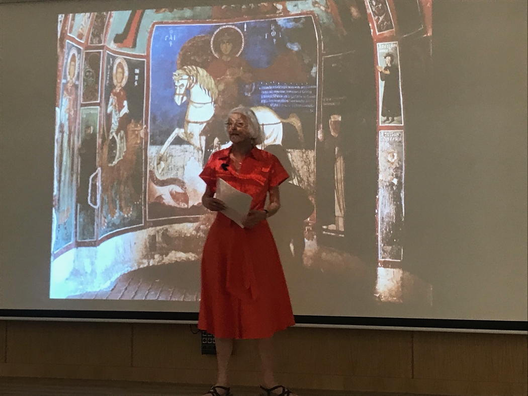 Ενθουσιώδης και γλαφυρότατη μίλησε για την ιστορία της μονής, για την ομορφιά του τοπίου, για τους σεισμούς και τις καταστροφές που επέφεραν, επεξήγησε το όνομά, στάθηκε με δέος μπροστά στις τοιχογραφίες και προσπάθησε να εξηγήσει με απλά λόγια, ποιος ήταν ο Μάγιστρος Νικηφόρος Ισχύριος και ποια η Γέφυρα και γιατί προσφέρει την εκκλησία, στάθηκε στην απόλυτη τρυφερότητα που χαρακτηρίζει την τόσο ανθρώπινη στιγμή της Κοίμησης, μίλησε για τους σαράντα μάρτυρες της Σεβάστειας, τον καβαλάρη και δοξαστικό Άγιο Γεώργιο, τον Παντοκράτορα…την Αγία Αναστασία, τη Νεστοριανή αρχόντισσα με τη μαύρη κάπα σε ένδειξη θρήνου για την απώλεια της Άκρας, τον καθολικό ιερέα, τα σκυλιά, τις τιμωρίες…Αναφέρθηκε στα διάφορα στρώματα των τοιχογραφιών, στις επιδράσεις από τη Βασιλεύουσα, τους Φράγκους τη σχέση του μοναστηριού με τον περίγυρο του, τον απλό κόσμο, τους δωρητές, τους άρχοντες…και τόνισε πόσο σημαντική είναι η υπέρλαμπρη και ταυτόχρονη τόσο ανθρώπινη μονή της Παναγίας Φορβιώτισσας στην παγκόσμια ιστορία της τέχνης!