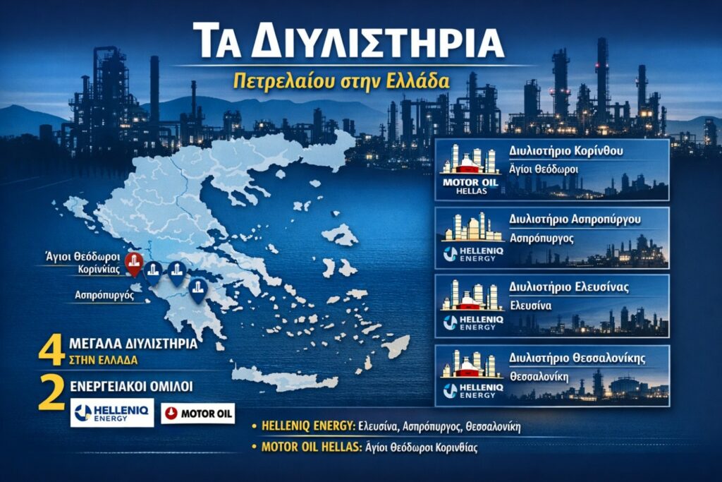 Στην Ελλάδα λειτουργούν τέσσερα μεγάλα διυλιστήρια πετρελαίου, τα οποία αποτελούν τον βασικό πυλώνα της εγχώριας διύλισης καυσίμων. Τρία από αυτά βρίσκονται στον Ασπρόπυργο, την Ελευσίνα και τη Θεσσαλονίκη και ανήκουν στον όμιλο HELLENiQ ENERGY (πρώην Ελληνικά Πετρέλαια), ενώ το τέταρτο βρίσκεται στους Αγίους Θεοδώρους Κορινθίας και ανήκει στη MotorOilHellas. (IEA, 2023· HELLENiQ ENERGY, 2024).