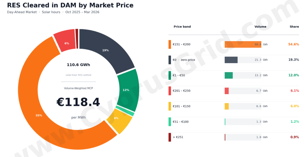 Τα διαθέσιμα στοιχεία δείχνουν ότι στις ώρες ηλιακής παραγωγής, η μεσοσταθμική τιμή διαμορφώνεται περίπου στα 118 €/MWh για την περίοδο Οκτωβρίου 2025 – Μαρτίου 2026. Παράλληλα, σχεδόν το 20% των ωρών ηλιακής παραγωγής εκκαθαρίζεται σε μηδενικές τιμές. Δηλαδή, σε ένα σημαντικό μέρος του χρόνου, η ενέργεια των ΑΠΕ που εισέρχεται στην αγορά δεν αμείβεται καθόλου.