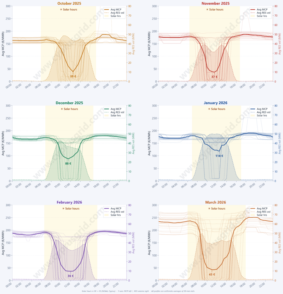 Όπως φαίνεται, σε όλους τους μήνες παρατηρείται το ίδιο επαναλαμβανόμενο μοτίβο: κατά τις ώρες αυξημένης παραγωγής από ΑΠΕ, οι τιμές συμπιέζονται σημαντικά, φτάνοντας σε πολύ χαμηλά επίπεδα. Ενδεικτικά περίπου €39 τον Οκτώβριο, €37 τον Νοέμβριο, €36 τον Φεβρουάριο και περίπου €43 τον Μάρτιο.