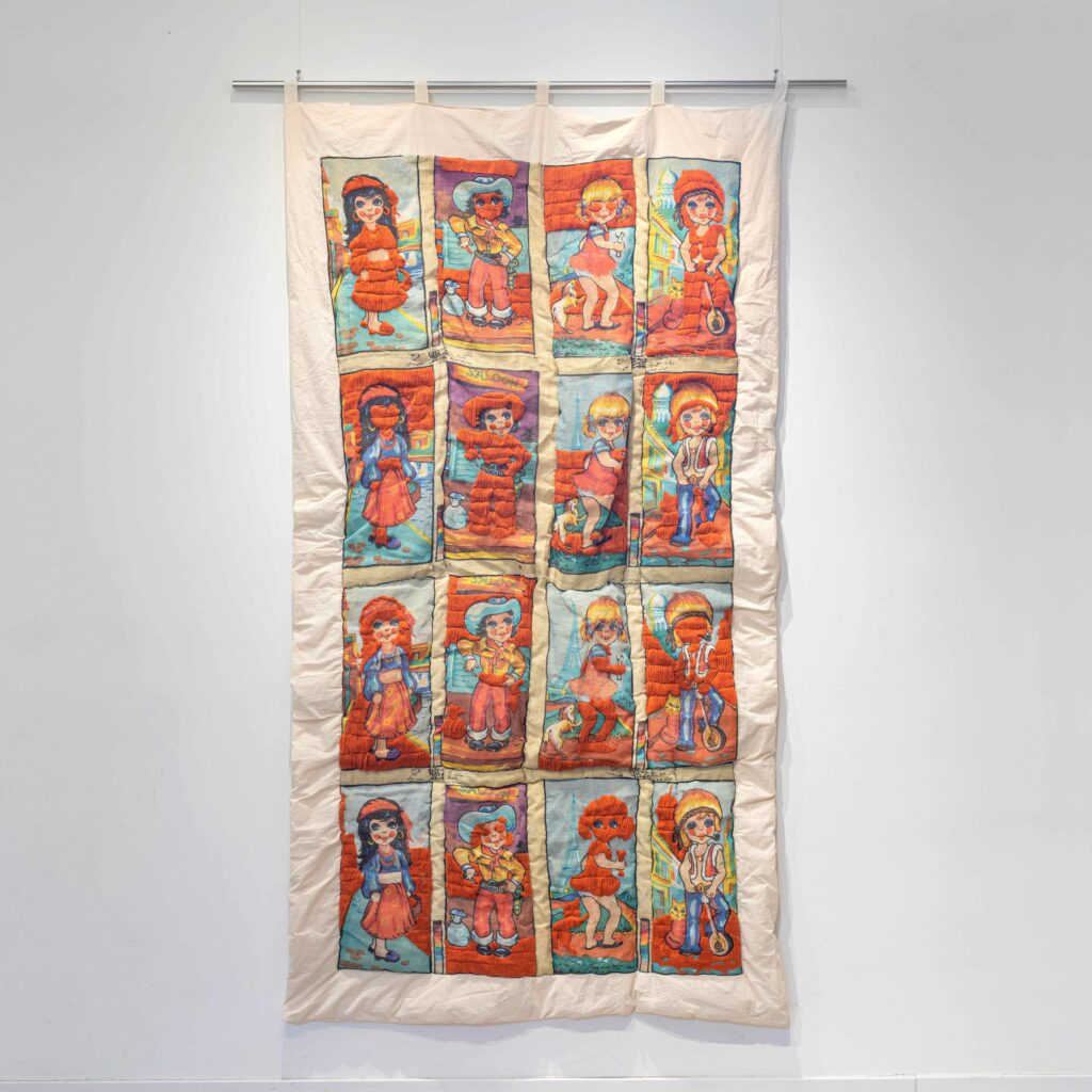 Η Sophie Utikal προσεγγίζει παρόμοια ζητήματα μέσα από μεγάλης κλίμακας υφασμάτινα έργα που συνδυάζουν διαφορετικά επίπεδα αφήγησης.