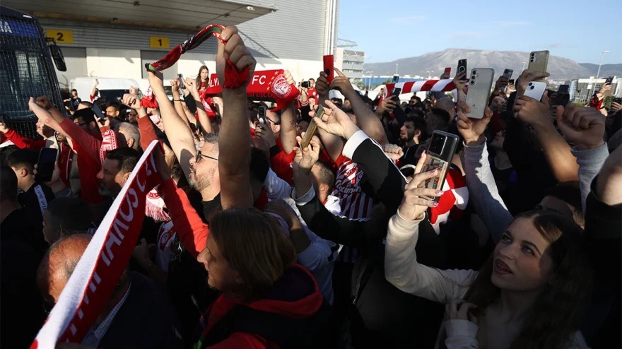 Εκατοντάδες οπαδοί των ερυθρόλευκων βρέθηκαν στο αεροδρόμιο για να αποθεώσουν τον Μιντιλίμπαρ και τους παίχτες του που βρίσκονται με το ένα πόδι στον τελικό της διοργάνωσης που θα διεξαχθεί στην OPAP Arena.