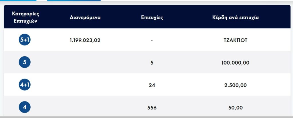 Στην πρώτη κατηγορία, στην οποία κληρώνονταν 1,1 εκατ. ευρώ δεν βρέθηκε τυχερός και στην επόμενη κλήρωση αύριο Τρίτη, θα κληρωθούν συνολικά 1.3 εκατ. ευρώ.