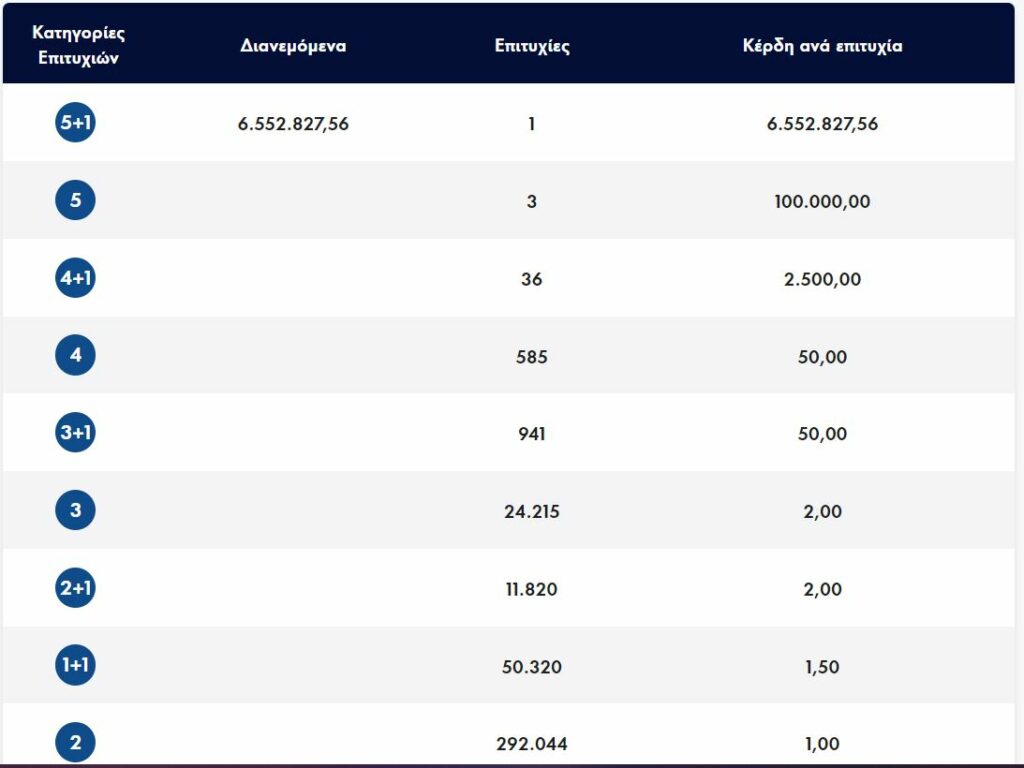 Παράλληλα, στην δεύτερη κατηγορία βρέθηκαν τρεις τυχεροί οι οποίοι κατάφεραν να κερδίσουν 100 χιλ. ευρώ ο καθένας.