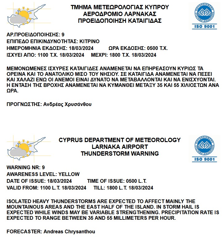 Η Μετεωρολογική Υπηρεσία εξέδωσε κίτρινη προειδοποίηση για τα έντονα καιρικά φαινόμενα που αναμένονται. Σύμφωνα με τη σχετική ανακοίνωση, μεμονωμένες ισχυρές καταιγίδες αναμένεται να επηρεάσουν κυρίως τα ορεινά και το ανατολικό μισό του νησιού. Σε καταιγίδα αναμένεται να πέσει και χαλάζι, ενώ οι άνεμοι είναι δυνατό να μεταβάλλονται και να ενισχύονται. Η ένταση της βροχής αναμένεται να κυμανθεί μεταξύ 35 και 55 χιλιοστών ανά ώρα.