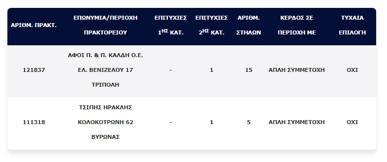Επίσης, δύο (2) τυχερά δελτία βρέθηκαν στην 2η κατηγορία (5), τα οποία κερδίζουν το ποσό των €100.000,00 για κάθε επιτυχία.