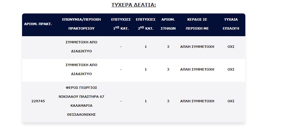Επίσης, τρία (3) τυχερά δελτία βρέθηκαν στη 2η κατηγορία (5), τα οποία κερδίζουν το ποσό των €100.000,00 για κάθε επιτυχία.