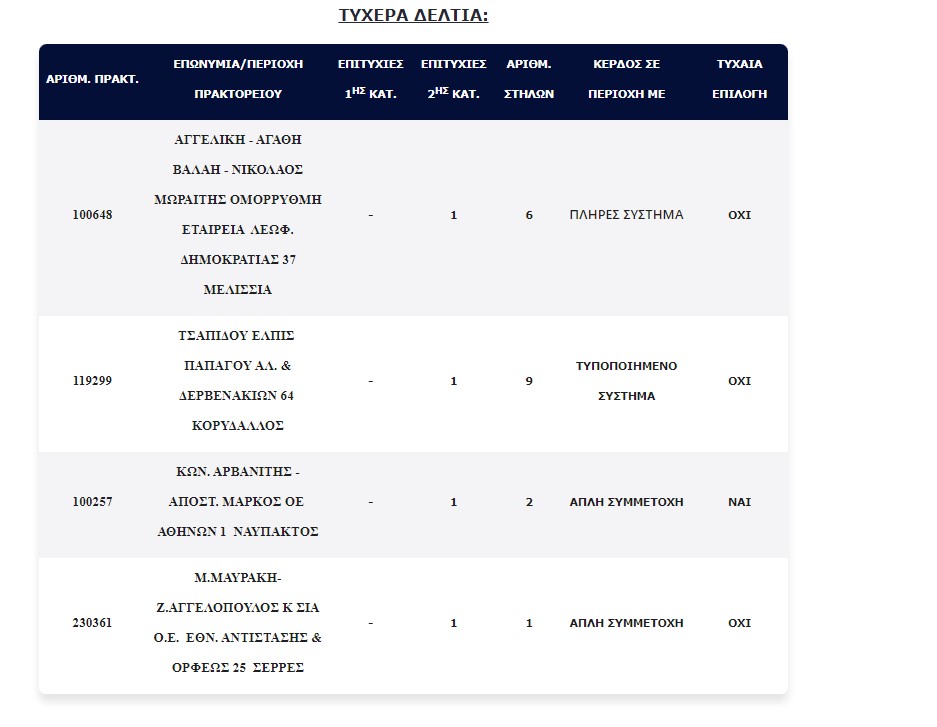 Επίσης, τέσσερα (4) τυχερά δελτία βρέθηκαν στη 2η κατηγορία (5), τα οποία κερδίζουν το ποσό των €100.000,00 για κάθε επιτυχία.