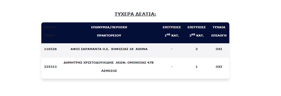 Σύμφωνα με τον ΟΠΑΠ, στην 2η κατηγορία (5άρια) βρέθηκαν τέσσερα τυχερά δελτία, καθένα από τα οποία κερδίζει €100.000.