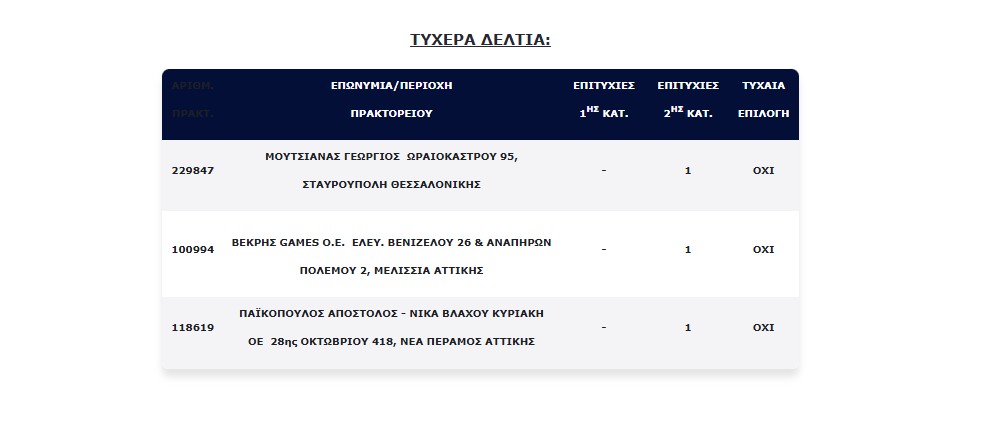 Στη χθεσινή διαλογή, τρία (3) τυχερά δελτία βρέθηκαν στη 2η κατηγορία (5), με κάθε επιτυχία να αποφέρει €100.000.