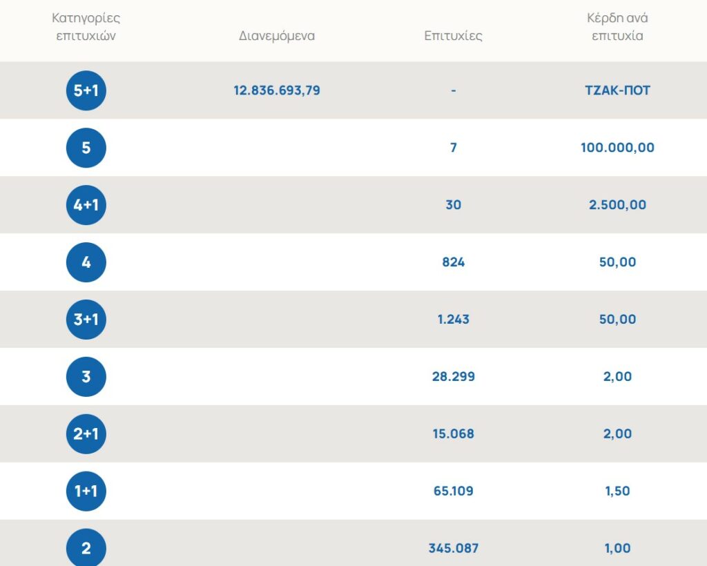 Στη χθεσινή διαλογή, επτά (7) τυχερά δελτία βρέθηκαν στη 2η κατηγορία (5), με κάθε επιτυχία να αποφέρει €100.000.