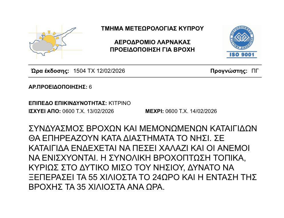 Η προειδοποίηση θα τεθεί σε ισχύ από τις 6:00 το πρωί αύριο (13/02) και θα διαρκέσει μέχρι και τις 6 το πρωί της επόμενης μέρας (14/02).