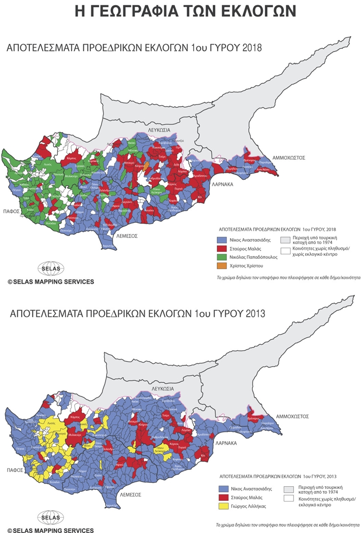 Με τη βοήθεια της τεχνολογίας και της εταιρείας SELAS MAPPING SERVICES ο «Φ» παρουσιάζει σήμερα τον χάρτη των προχθεσινών προεδρικών εκλογών με τα προπύργια των διαφόρων υποψηφίων. Εμφανίζονται με διαφορετικά χρώματα όλα τα εκλογικά κέντρα στα οποία επικράτησαν οι υποψήφιοι. Στον κάτω χάρτη εμφανίζονται τα ανάλογα προπύργια στον πρώτο γύρο των εκλογών στις προεδρικές του 2013.