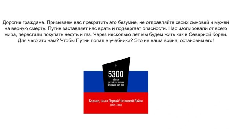 «Σας καλούμε να σταματήσετε αυτήν την παράνοια, μην στέλνετε τους γιους σας και τους άνδρες σας στον βέβαιο θάνατο… Ο Πούτιν μας αναγκάζει να λέμε ψέματα και μας βάζει σε κίνδυνο… Ο πόλεμος δεν είναι δικός μας, ας τον σταματήσουμε!».