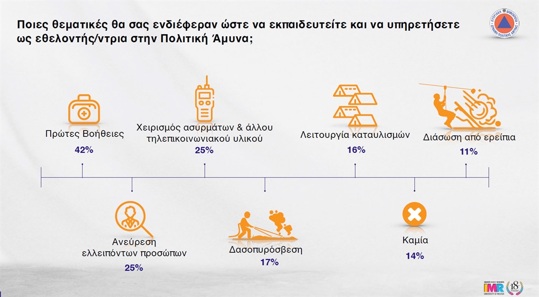 Αναφορικά με το ρόλο της Πολιτικής Άμυνας, η έρευνα καταγράφει πολύ ενδιαφέροντα ευρήματα για όσους συμμετέχουν ως εθελοντές ή υπόχρεοι Αμυνίτες, οι οποίοι αξιολογούν ως πολύ χρήσιμη (18%) ή αρκετά χρήσιμη (41%) την συμμετοχή τους. Είναι ιδιαίτερα ικανοποιημένοι από την απόκτηση δεξιοτήτων σε θέματα πρώτων βοηθειών και άλλων γνώσεων, την ενημέρωση για λήψη μέτρων αυτοπροστασίας και για την προσφορά στον συνάνθρωπό τους.