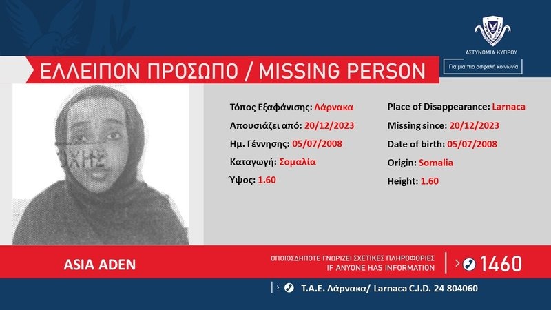 Η Αστυνομία ζητά πληροφορίες που μπορούν να βοηθήσουν στον εντοπισμό της ASIA ADEN, 15 ετών, από τη Σομαλία, η οποία απουσιάζει από το χώρο διαμονής της, στη Λάρνακα, από τις 20 Δεκεμβρίου 2023.