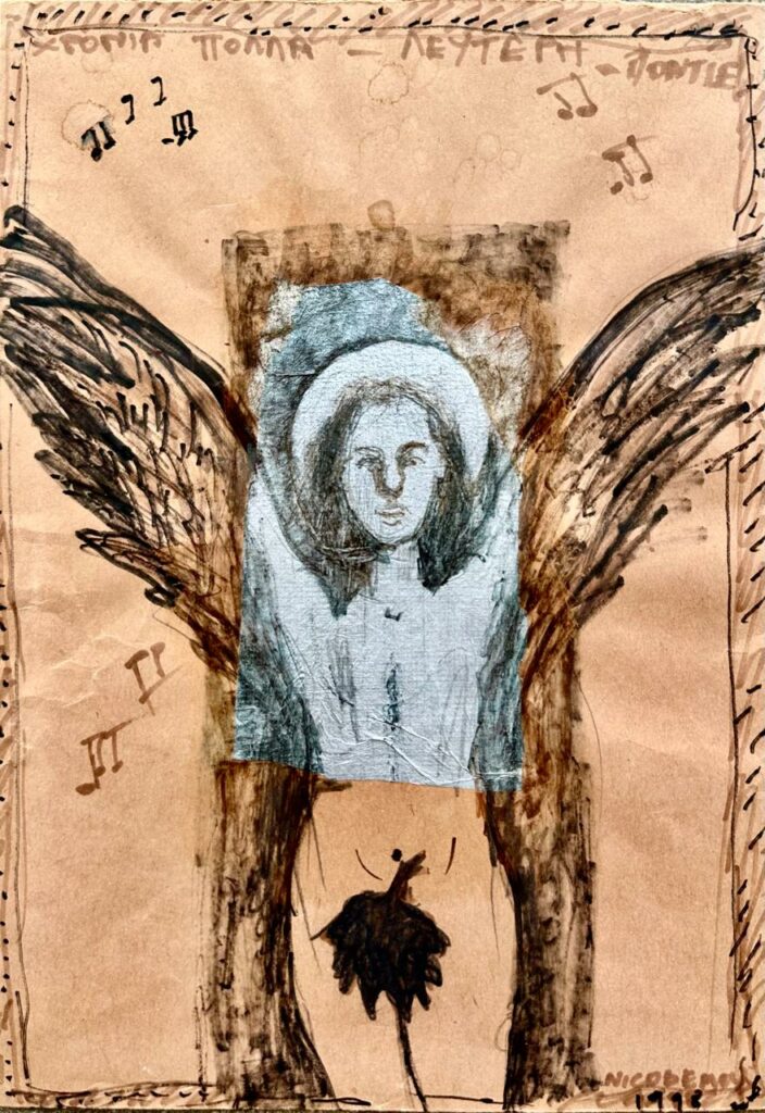 «Στην Papiers-Fountain of Desires επιλέγω για αρχή να σταθώ στα αρχιτεκτονικά σχέδια του Νεοπτόλεμου Μιχαηλίδη τα οποία εκτίθενται. Τη δύναμη του χρόνου» σημειώνει η Μαρία Ευσταθίου. «Ή καλύτερα, τον τρόπο με τον οποίο ο χρόνος μεταποιεί τις σημειώσεις και τα αρχεία. Πώς τα σημεία και οι γραμμές που επιλέγει κάποιος να ορίσει- ή και να συνθέσει- σε ένα χαρτί, αποκτούν διαφορετική αξία σε μελλοντικό χρόνο. Στέκομαι επίσης και στην τεχνική του Στέλιου Βότση. Που, εν ευφυΐα του, συνέθεται τα έργα του χρησιμοποιώντας “μόλες” (ή στενσιλ αν προτιμάτε). Αυτή η μηχανική επανάληψη της φόρμας, μπορεί να “διαβαστεί” και ως ποιητική χειρονομία. Ό,τι η επανάληψη μιας μορφής μπορεί να ανανεώνεται χωρίς να χάνει την ταυτότητά της. Γι’ αυτό οι φιγούρες στα έργα του Βότση, όπως και άλλα σχήματα και μοτίβα, επαναλαμβάνονται στο εύρος του έργου του, σαν ρυθμικά σημεία».