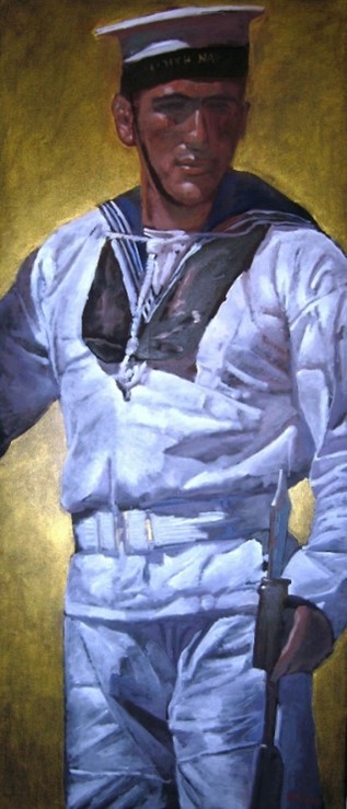 Ρεαλιστική ανδρική μορφή του Ανδρέα Καραγιάν με έμφαση στη φυσιογνωμική απόδοση και τη μνημειακή παρουσία της φιγούρας. Η δεξιοτεχνική χρήση του φωτός και η αντίθεση του λευκού ενδύματος με το θερμό φόντο αναδεικνύουν τον όγκο και τη δομή της σύνθεσης. Έργο με ξεκάθαρη ζωγραφική αξία και υψηλή ζήτηση μεταξύ συλλεκτών, εκτιμώμενο στα €3.000–4.000. Τιμή εκκίνησης στα €2.500.