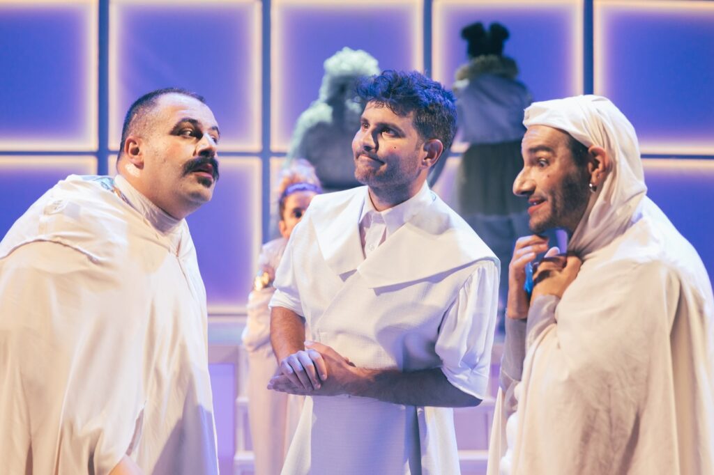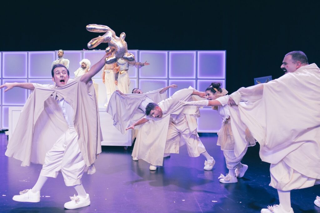 Η ζωντανή αυτή ιστορία δεν μένει μόνο στο χαρτί· παίρνει σάρκα και οστά στη σκηνή μέσα από τη σκηνοθετική ματιά της Μαρίνας Βρόντη, που επιστρέφει στη Σκηνή 018 για να στήσει ένα πολύχρωμο και ξέφρενο σκηνικό παιχνίδι. Σε ένα αποκαλυπτικό σκηνικό, όπου όλα είναι ταυτόχρονα κρυφά και φανερά, οι εννιά ηθοποιοί της παράστασης μοιράζονται έναν υποκριτικό κώδικα τολμηρό, σωματικά εκφραστικό και αστείο και κλείνουν διακριτικά το μάτι στο κοινό, που τα παρακολουθεί όλα, απλώνοντάς του έναν καθρέφτη όπου όποιος κοιτάξει μέσα του θα αναγνωρίσει την αντανάκλασή του – ακόμα και παραμορφωμένη.