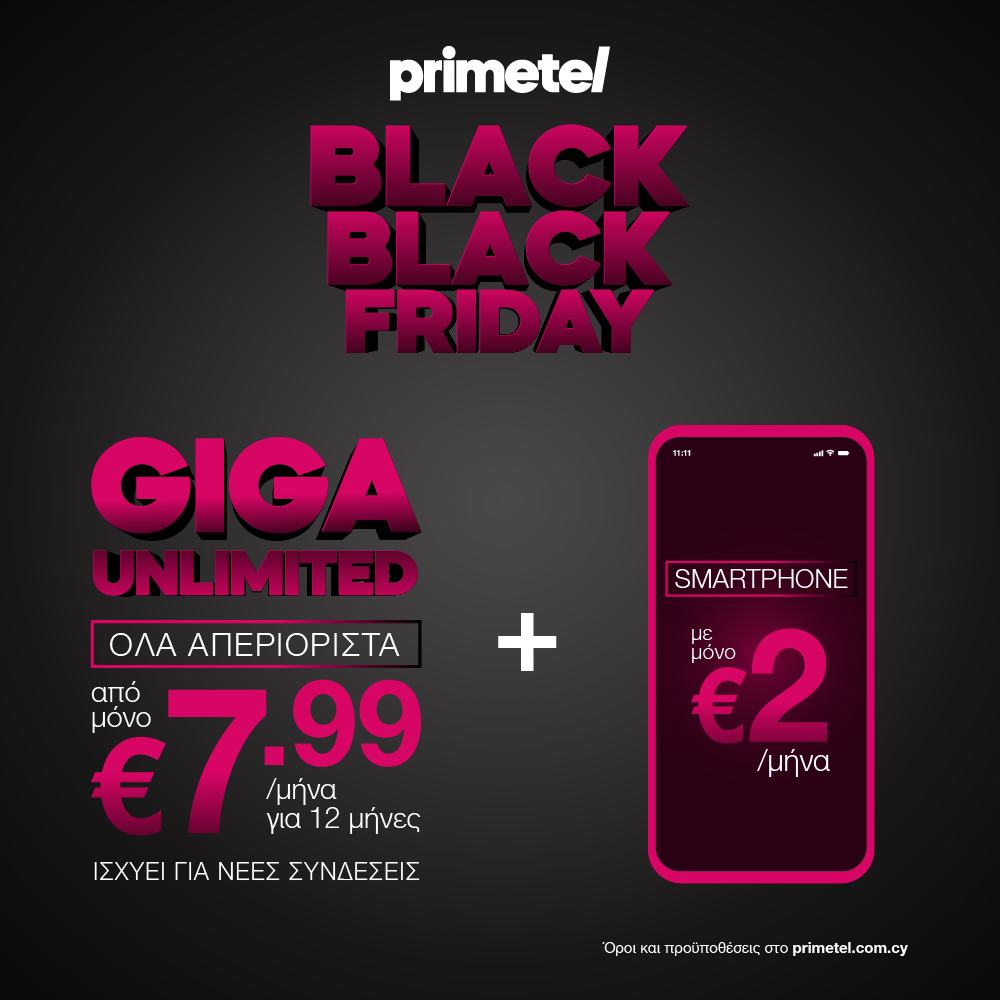 Η προσφορά θα ισχύει μόνο για λίγες μέρες, γι’ αυτό τρέξτε να επωφεληθείτε της Black Black Friday προσφοράς! Συνδεθείτε online στο primetel.com.cy, επισκεφθείτε ένα κατάστημα Primetel ή τηλεφωνικά στο 133.