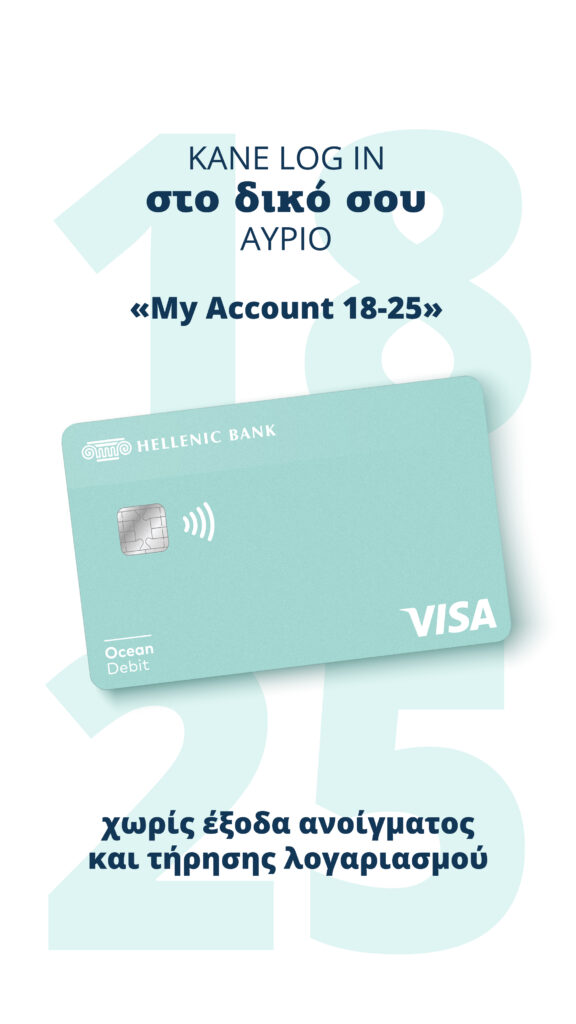 Ο λογαριασμός «My Account 18-25» είναι σχεδιασμένος αποκλειστικά για τους νέους προσφέροντας εύκολη πρόσβαση σε χρήματα, ευνοϊκές χρεώσεις, μοναδικά προνόμια, εξαιρετική εμπειρία πελάτη και φυσικά πρόσβαση σε όλα τα ψηφιακά κανάλια της τράπεζας.