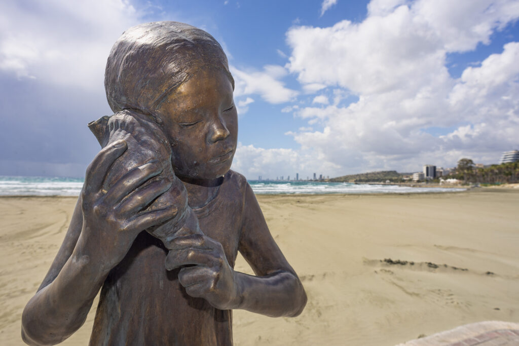 Το νέο γλυπτό είναι ένα έργο της Κύπριας γλύπτριας Γιώτας Ιωαννίδου και αναπαριστά ένα κορίτσι που κρατάει στο αυτί του ένα κοχύλι και αφουγκράζεται. Έχει ύψος 140 εκ. και είναι φτιαγμένο από μπρούτζο και τοποθετημένο σε βάση από βράχο της περιοχής. Το έργο συμβολίζει τη σχέση του ανθρώπου με τη θάλασσα, όπου η θάλασσα αφηγείται μυστικά και ιστορίες από τα βάθη του χρόνου.