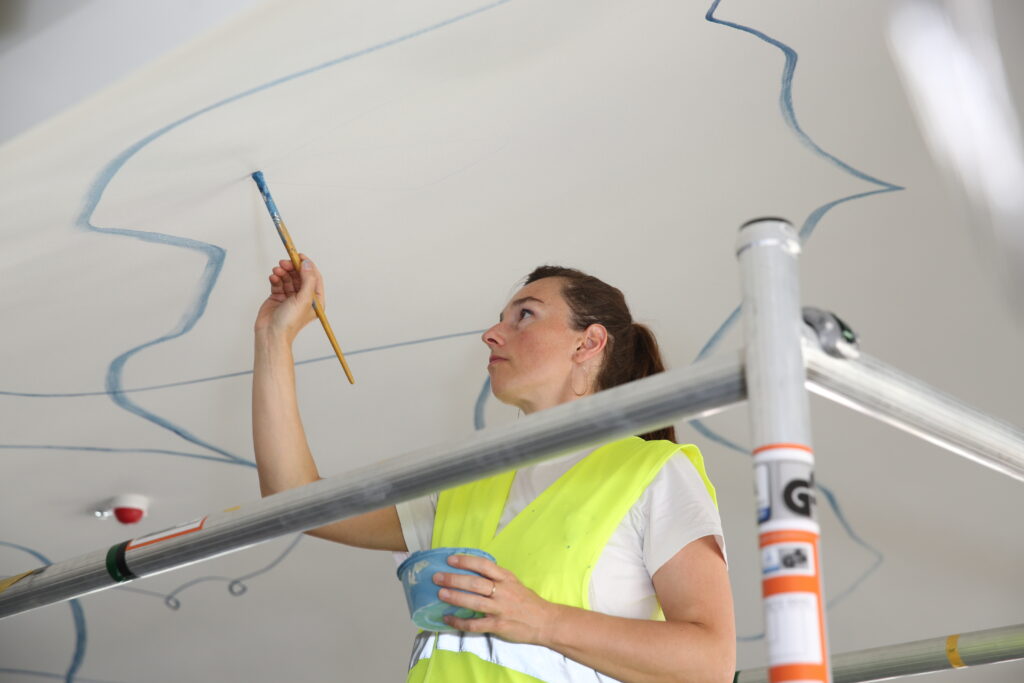 Το εντυπωσιακό αυτό έργο τέχνης καλύπτει ολόκληρη την οροφή με τα τέσσερα κοίλα μέρη της και εκτείνεται σε 206 τετραγωνικά μέτρα, ενώ είναι εμπνευσμένο από την κυπριακή κληρονομιά και αποτίνει φόρο τιμής στη μακρά και συναρπαστική ιστορία της πόλης. «Η εικαστική σύνθεση η οποία καλύπτει ολόκληρη την οροφή του Orangery αντικατοπτρίζει τη στενή σχέση της Λευκωσίας με το νερό, μία πολύτιμη πηγή ζωής. Με έμπνευση τις παραδοσιακές αυλές με τα πηγάδια και τα ρυάκια τους, όπου μέσα μεγάλωναν πορτοκαλιές, αυτό το έργο μεταμορφώνει αυτά τα στοιχεία που δίνουν ζωή σε γραμμές γεμάτες ροή. Αυτές οι φόρμες παραπέμπουν σε αρχαία κυπριακά μοτίβα, που κάποτε συναντούσαμε χαραγμένα σε κεραμικά σκευή και άλλα προϊόντα που οι κάτοικοι εξήγαγαν στην Μεσόγειο, ενώ ταυτόχρονα συμβολίζουν τις διαφορετικές ιστορίες και κουλτούρες που συναντώνται στη Λευκωσία, ένα «χωνευτήρι» πολιτισμών και ιστορίας. Το έργο προτρέπει τους επισκέπτες να αφήσουν τη φαντασία τους ελεύθερη, ενώ τιμά την έννοια της κοινότητας, της κληρονομιάς και του ποιητικού πνεύματος της κυπριακής φιλοξενίας», δηλώνει η καλλιτέχνιδα, η οποία ταξίδεψε μέχρι την Λευκωσία για πρώτη φορά στη ζωή της, προκειμένου να δημιουργήσει αυτό το μοναδικό έργο.