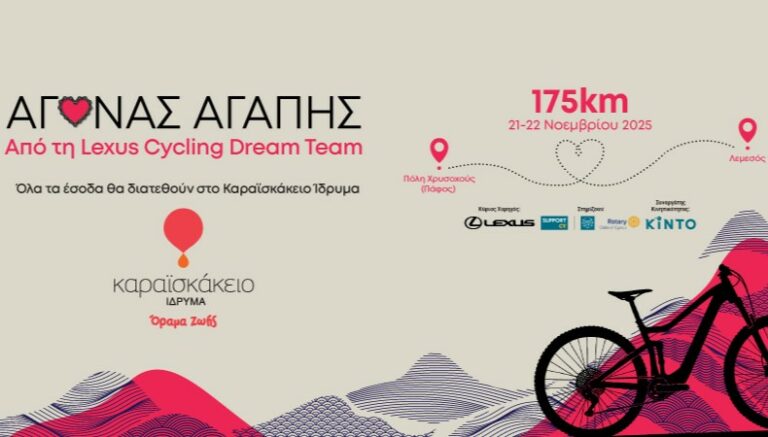 Η Lexus Cycling Dream Team, μια ομάδα στελεχών του κυπριακού επιχειρηματικού κόσμου που μοιράζονται το ίδιο πάθος για την ποδηλασία και την προσφορά, επιστρέφει και φέτος με τον φιλανθρωπικό «Αγώνα Αγάπης», στηρίζοντας αυτή τη φορά το πρόγραμμα διερεύνησης και διάγνωσης του Κέντρου Παιδικού Καρκίνου του Καραϊσκάκειου Ιδρύματος. Με τη στήριξη της KINTO Europe, των Ροταριανών Ομίλων Κύπρου και τη συμμετοχή του CEO της Toyota & Lexus Πορτογαλίας.