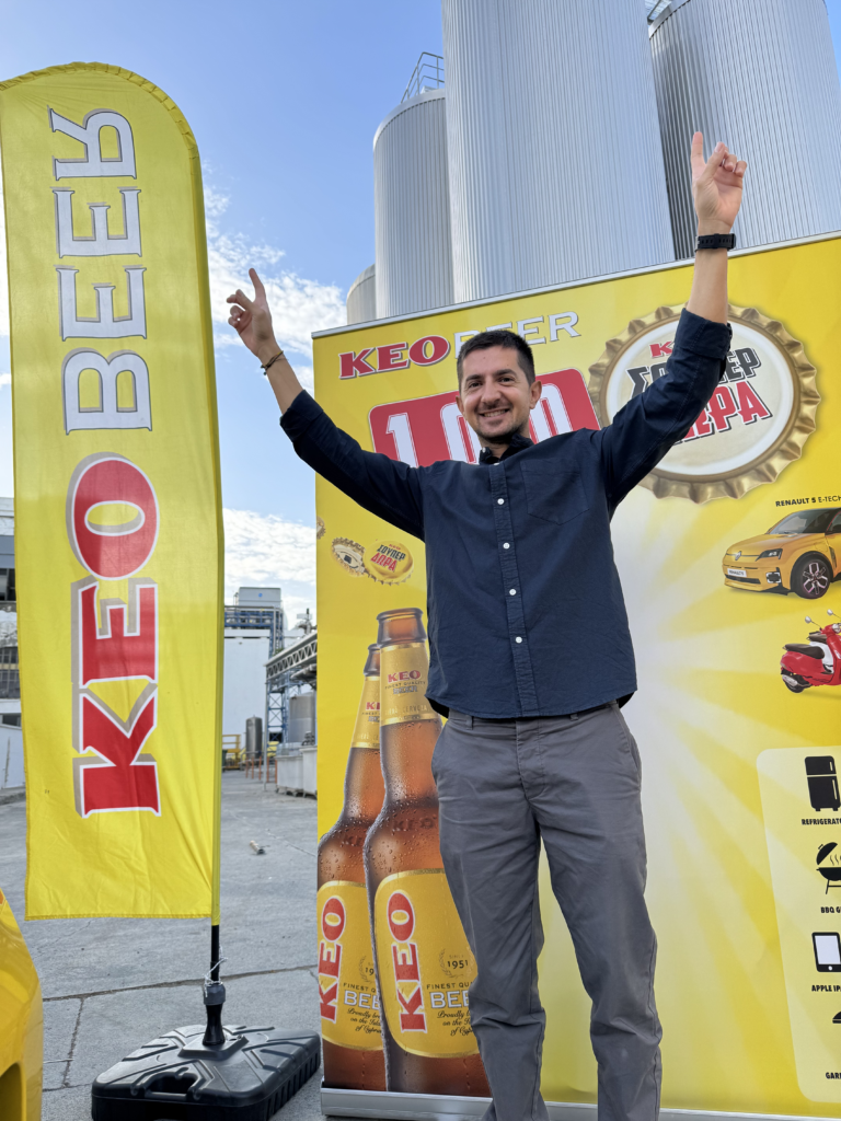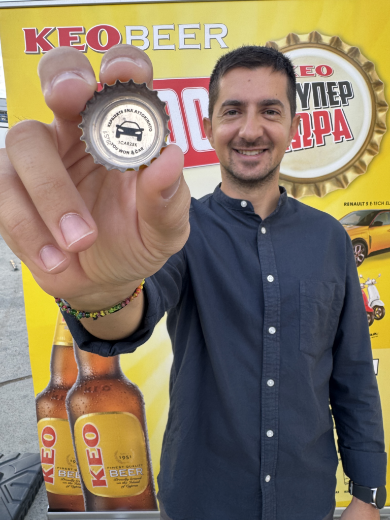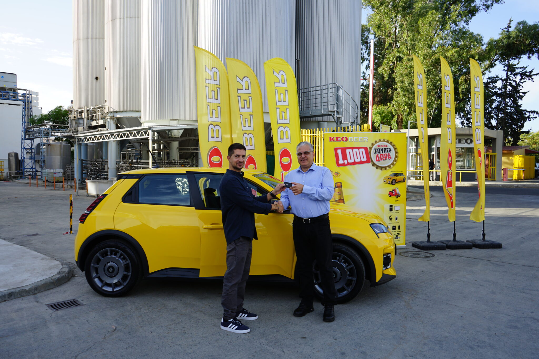 Η προωθητική ενέργεια της μπύρας ΚΕΟ 1,000 ΣΟΥΠΕΡ ΔΩΡΑ κορυφώθηκε με την παράδοση του μεγάλου δώρου στον τυχερό καταναλωτή που βρήκε στο πώμα της φιάλης του, το σήμα με το αυτοκίνητο. Ο κ. Πέτρος Κουσιάππας από τη Λάρνακα είναι ο μεγάλος τυχερός που κέρδισε ένα Renault 5 E-Tech Electric το οποίο παρέλαβε από τα κεντρικά γραφεία της ΚΕΟ στη Λεμεσό. Ο Διευθύνων Σύμβουλος της ΚΕΟ κ. Χαράλαμπος Παναγιώτου συνεχάρηκε τον κ. Κουσσιάππα και του παρέδωσε τα κλειδιά του ολοκαίνουργιου αυτόματου Renault 5, με την ευχή να είναι καλοτάξιδο. Ο κ. Κουσιάππας, εμφανώς χαρούμενος, ευχαρίστησε την εταιρεία και περιέγραψε τη στιγμή της έκπληξης και της χαράς του, όταν, ανοίγοντας μια μπύρα ΚΕΟ, είδε κάτω από το καπάκι της το σήμα με το μεγάλο δώρο.
