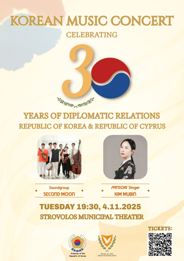 Με την ευκαιρία της 30ής επετείου διπλωματικών σχέσεων μεταξύ της Δημοκρατίας της Κορέας και της Κυπριακής Δημοκρατίας, μια συναυλία κορεατικής μουσικής θα πραγματοποιηθεί την Τρίτη, 4 Νοεμβρίου 2025 στην Κύπρο.