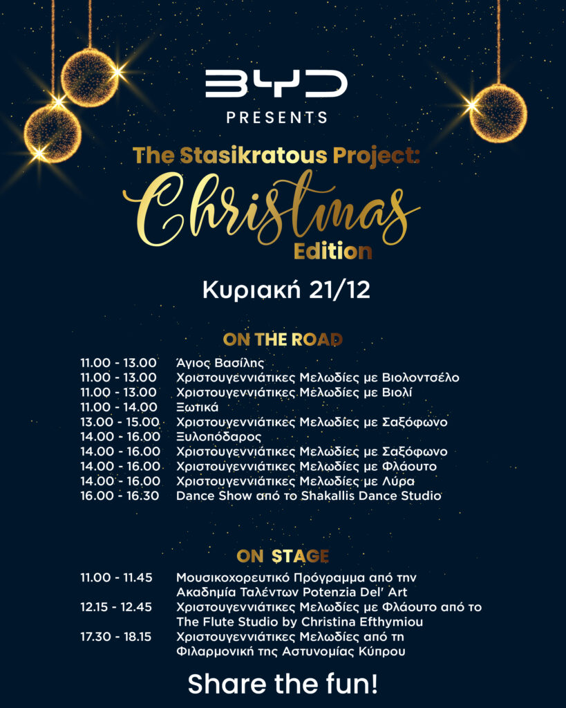 Το γνωστό street party της Οδού Στασικράτους επιστρέφει και φέτος με τον τίτλο «BYD presents The Stasikratous Project Christmas Edition», στην οδό Στασικράτους και τους παρακείμενους δρόμους το Σαββατοκύριακο 20 & 21 Δεκεμβρίου από τις 10:00 μέχρι τις 20:00.