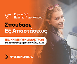 Το Ευρωπαϊκό Πανεπιστήμιο Κύπρου συνεχίζει να δέχεται αιτήσεις εισαγωγής για το Φθινοπωρινό Εξάμηνο 2026. Για εγγραφές έως 12 Ιουνίου παρέχεται ειδική μείωση διδάκτρων.