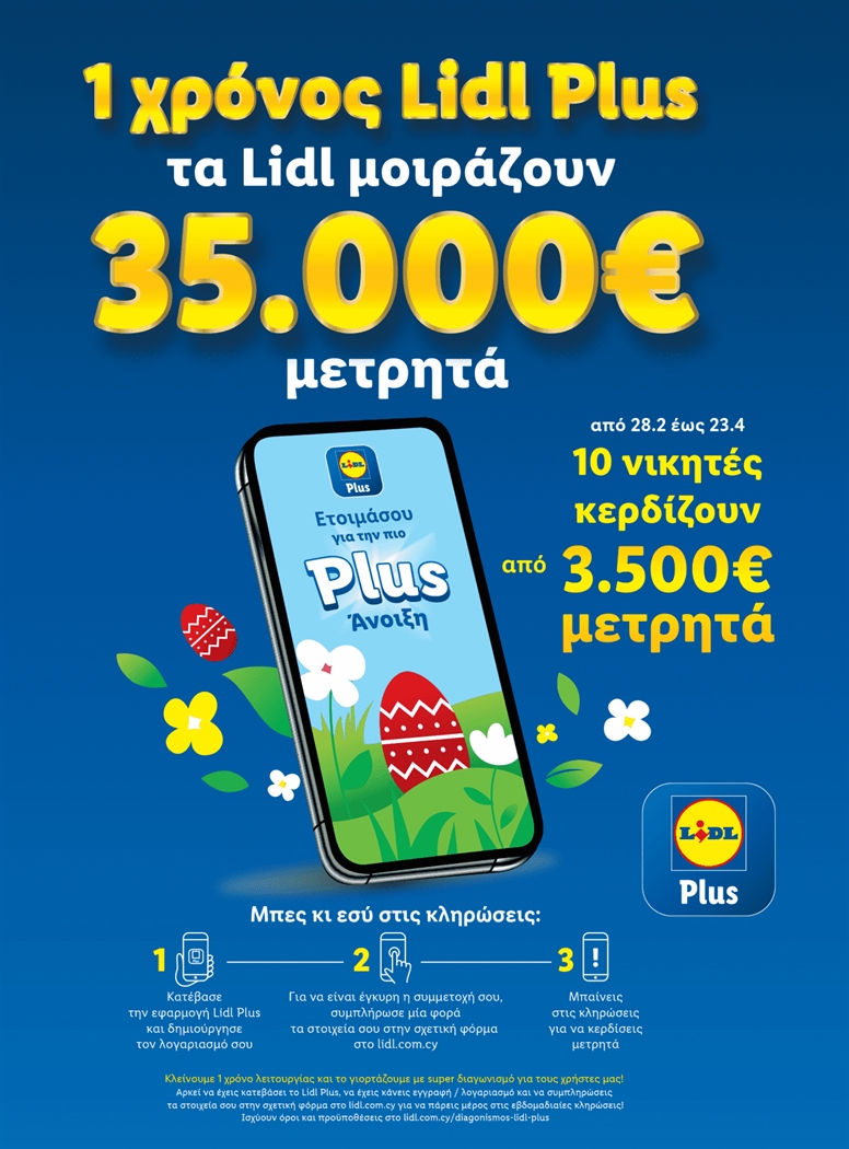 Τo Lidl Plus γιορτάζει τον πρώτο χρόνο λειτουργίας του με έναν μεγάλο διαγωνισμό, έως τις 23.04.2022, στον οποίο θα χαρίσει σε 10 τυχερούς εγγεγραμμένους χρήστες...