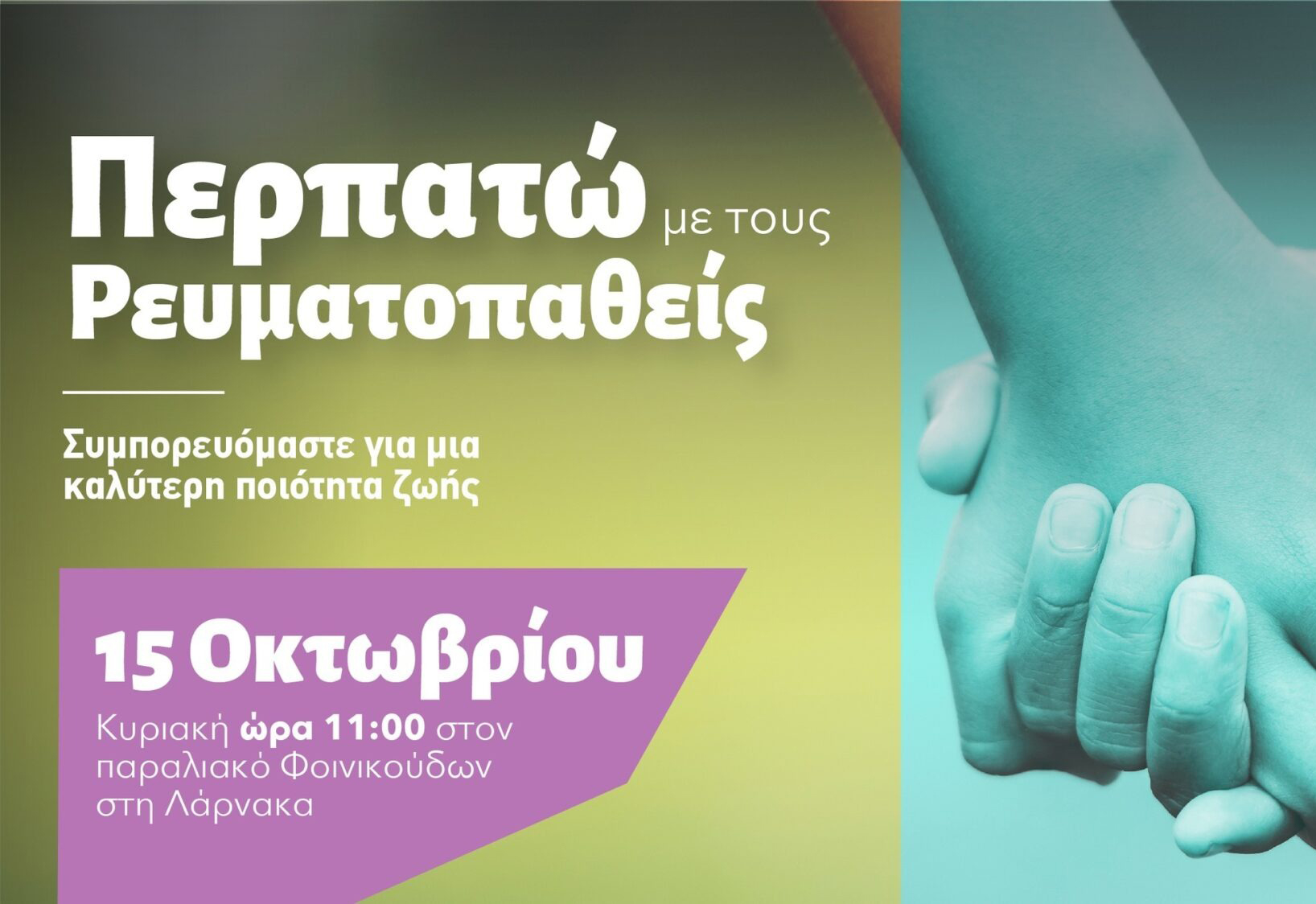 Στις 15 Οκτωβρίου Περπατώ με τους ρευματοπαθείς! Επί ευκαιρίας της παγκόσμιας Ημέρα Ρευματοπαθειών και με σύνθημα ‘’φόρεσε με’’ στηρίξτε και εσείς τον Σύνδεσμο Ρευματοπαθών Κύπρου. Φορέσετε...