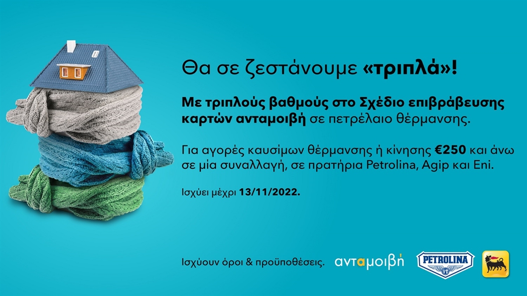 Τριπλοί βαθμοί με αγορές σε πετρέλαιο θέρμανσης ή κίνησης, από τις 24 Οκτωβρίου μέχρι τις 13 Νοεμβρίου, στα πρατήρια Πετρολίνα, Agip και Εni.