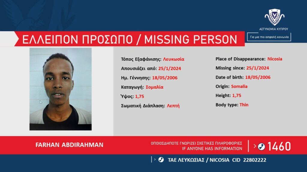 Η Αστυνομία ζητά πληροφορίες που μπορούν να βοηθήσουν στον εντοπισμό του FARHAN ABDIRAHMAN, 17ετών, από τη Σομαλία, ο οποίος απουσιάζει από τις 25/1/2024, από το χώρο διαμονής του στη Λευκωσία.