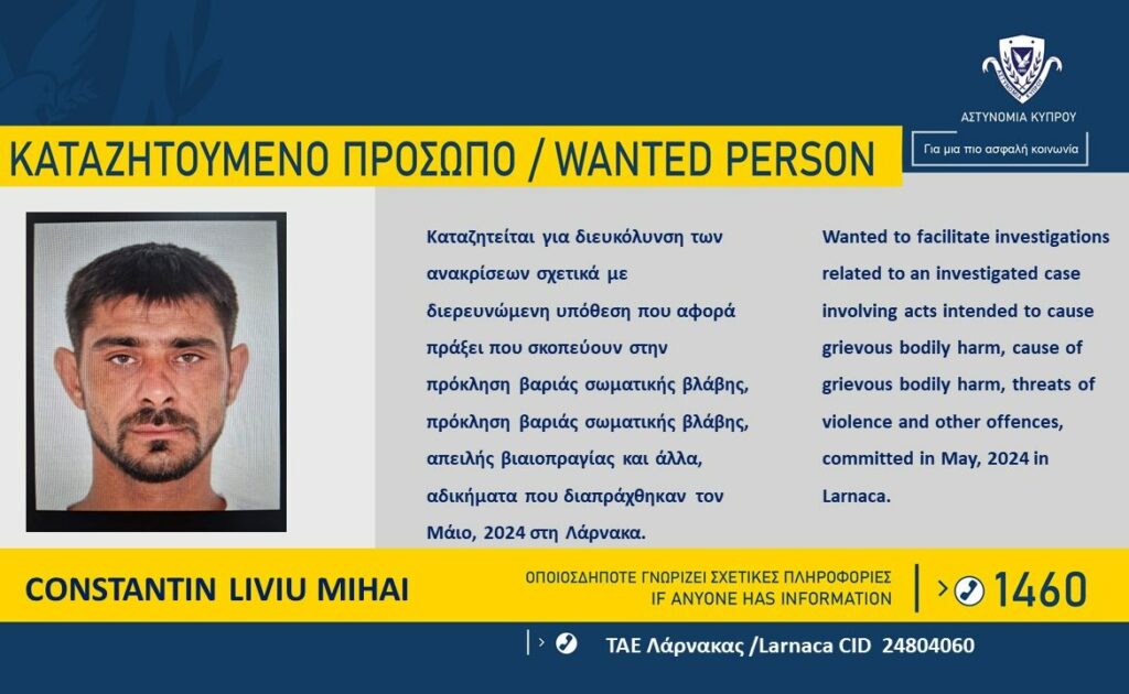 Η Αστυνομία ζητεί πληροφορίες για εντοπισμό του CONSTANTIN LIVIU MIHAI, 45 ετών, από τη Ρουμανία, η φωτογραφία του οποίου δημοσιεύεται, σχετικά με διερευνώμενη υπόθεση που αφορά στα αδικήματα των πράξεων που σκοπεύουν στην πρόκληση βαριάς σωματικής βλάβης, πρόκλησης βαριάς σωματικής βλάβης, επίθεσης με πρόκληση βαριάς σωματικής βλάβης, απειλής βιαιοπραγίας και άλλα, που διαπράχθηκαν τον Μάιο του 2024 στη Λάρνακα.