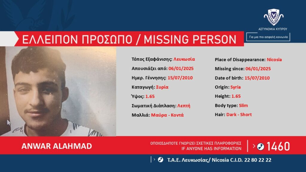 Πρόκειται για τον Anwar Alahmad, ημερομηνία γέννησης 15/07/2010, από Συρία, ο οποίος ελλείπει από τη Δευτέρα, 06 Ιανουαρίου, 2025. Ο 14χρονος περιγράφεται ως ύψους 1.65μ. περίπου, λεπτής σωματικής διάπλασης, με καστανά μάτια και με κοντά, μαύρα μαλλιά.