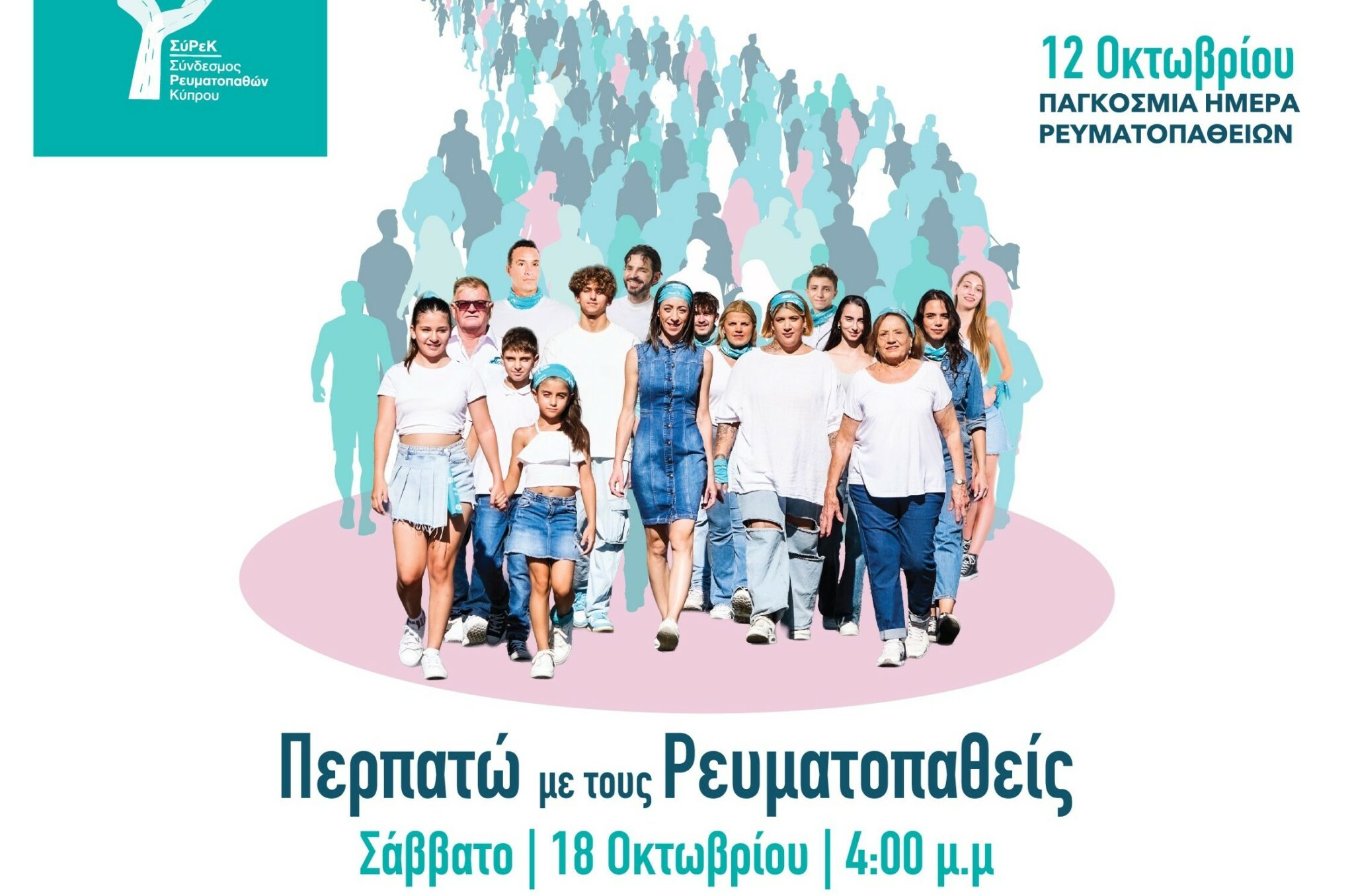 Με αφορμή την Παγκόσμια Ημέρα Ρευματοπαθειών, ο Σύνδεσμος Ρευματοπαθών Κύπρου (ΣύΡεΚ) προσκαλεί το κοινό να συμμετάσχει στην καθιερωμένη εκδήλωση «Περπατώ με τους Ρευματοπαθείς», το Σάββατο 18 Οκτωβρίου, στις 4:00 μ.μ., στον πεζόδρομο των Φοινικούδων στη Λάρνακα (έναρξη από την Πλατεία Ευρώπης).