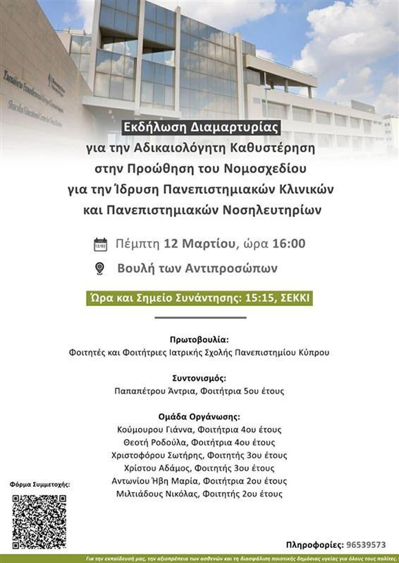Εκδήλωση διαμαρτυρίας έξω από τη Βουλή των Αντιπροσώπων διοργανώνουν την Πέμπτη 12 Μαρτίου οι φοιτητές και οι φοιτήτριες της Ιατρικής Σχολής του Πανεπιστημίου Κύπρου, ζητώντας την άμεση προώθηση του νομοσχεδίου για την ίδρυση Πανεπιστημιακών Κλινικών και Πανεπιστημιακών Νοσηλευτηρίων.