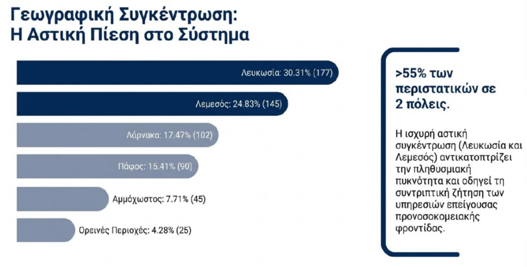 Συγκεκριμένα, το 30,31% σημειώθηκε στη Λευκωσία και το 24,83% στη Λεμεσό, και ακολουθούσαν η Λάρνακα με 17,47%, η Πάφος με 15,41% και η Αμμόχωστος με 7,71%. Στις ορεινές περιοχές καταγράφηκε μόλις το 4,28% των περιστατικών.