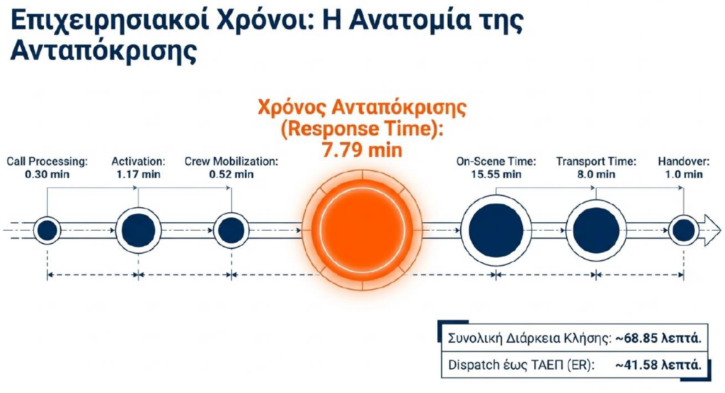 Ωστόσο, η ανάλυση δείχνει σημαντική μεταβλητότητα σε ορισμένα περιστατικά, με χρόνο ανταπόκρισης που φτάνει έως και τα 15 λεπτά σε συγκεκριμένες περιπτώσεις.