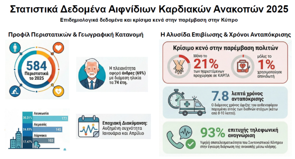 > Το 2025, καταγράφηκαν συνολικά 584 περιστατικά αιφνίδιας καρδιακής ανακοπής με την εικόνα αυτή να είναι συμβατή με τα ευρωπαϊκά δεδομένα ως προς τη συχνότητα των περιστατικών. Με βάση τον πληθυσμό της Κύπρου, η επίπτωση αντιστοιχεί περίπου σε 46 περιστατικά ανά 100.000 κατοίκους ετησίως, αριθμός που βρίσκεται εντός του εύρους που καταγράφεται σε πολλές χώρες της Ευρωπαϊκής Ένωσης. (σ.σ. Σύμφωνα με τα δεδομένα των ευρωπαϊκών μηχανισμών καταγραφής δεδομένων (registries) και των μελετών EuReCa του Ευρωπαϊκού Συμβουλίου Αναζωογόνησης, η επίπτωση εξωνοσοκομειακής καρδιακής ανακοπής που αντιμετωπίζεται από υπηρεσίες ασθενοφόρων κυμαίνεται συνήθως μεταξύ 40 και 80 περιστατικών ανά 100.000 κατοίκους ετησίως).