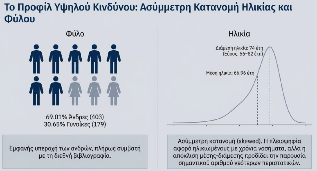 > Η ανάλυση δείχνει σαφή υπεροχή των ανδρών, τους οποίους αφορούσε το 69% των περιστατικών, έναντι 30,65% των γυναικών. Πρόκειται για εικόνα που συμφωνεί με τα διεθνή επιδημιολογικά δεδομένα.