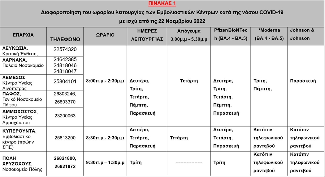 Τα εμβολιαστικά κέντρα σε όλες τις επαρχίες θα λειτουργήσουν επιπλέον και τα Σάββατα 26 Νοεμβρίου και 3 Δεκεμβρίου 2022, από τις 8:30πμ μέχρι τις 12:30πμ...