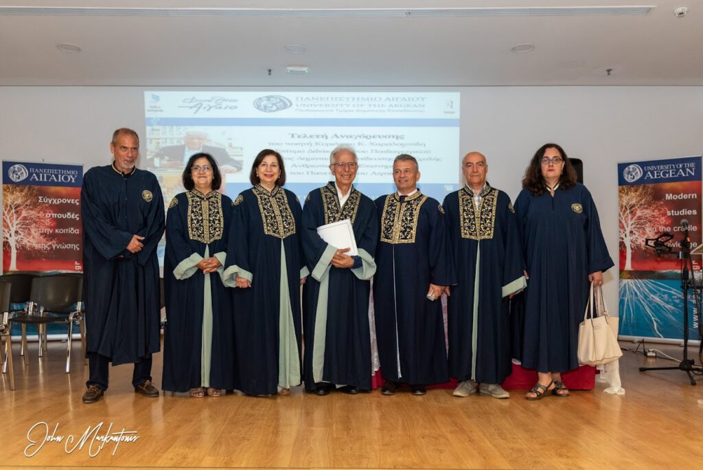 Μετά τους χαιρετισμούς από τον Πρύτανη του Πανεπιστημίου Αιγαίου, Καθηγητή Ανδρέα Ι. Τρούμπη, τον Κοσμήτορα της Σχολής Ανθρωπιστικών Επιστημών, Καθηγητή Ιωάννη Σεϊμένη και τον Πρόεδρο του Παιδαγωγικού Τμήματος Δημοτικής Εκπαίδευσης, Καθηγητή Πολύκαρπο Καραμούζη, η καθηγήτρια του Παιδαγωγικού Τμήματος Δημοτικής Εκπαίδευσης Λουΐζα Χριστοδουλίδου παρουσίασε με λόγο θαυμαστό, περιεκτικό και ιδιαιτέρως επαινετικό την προσωπικότητα και το έργο του τιμωμένου.